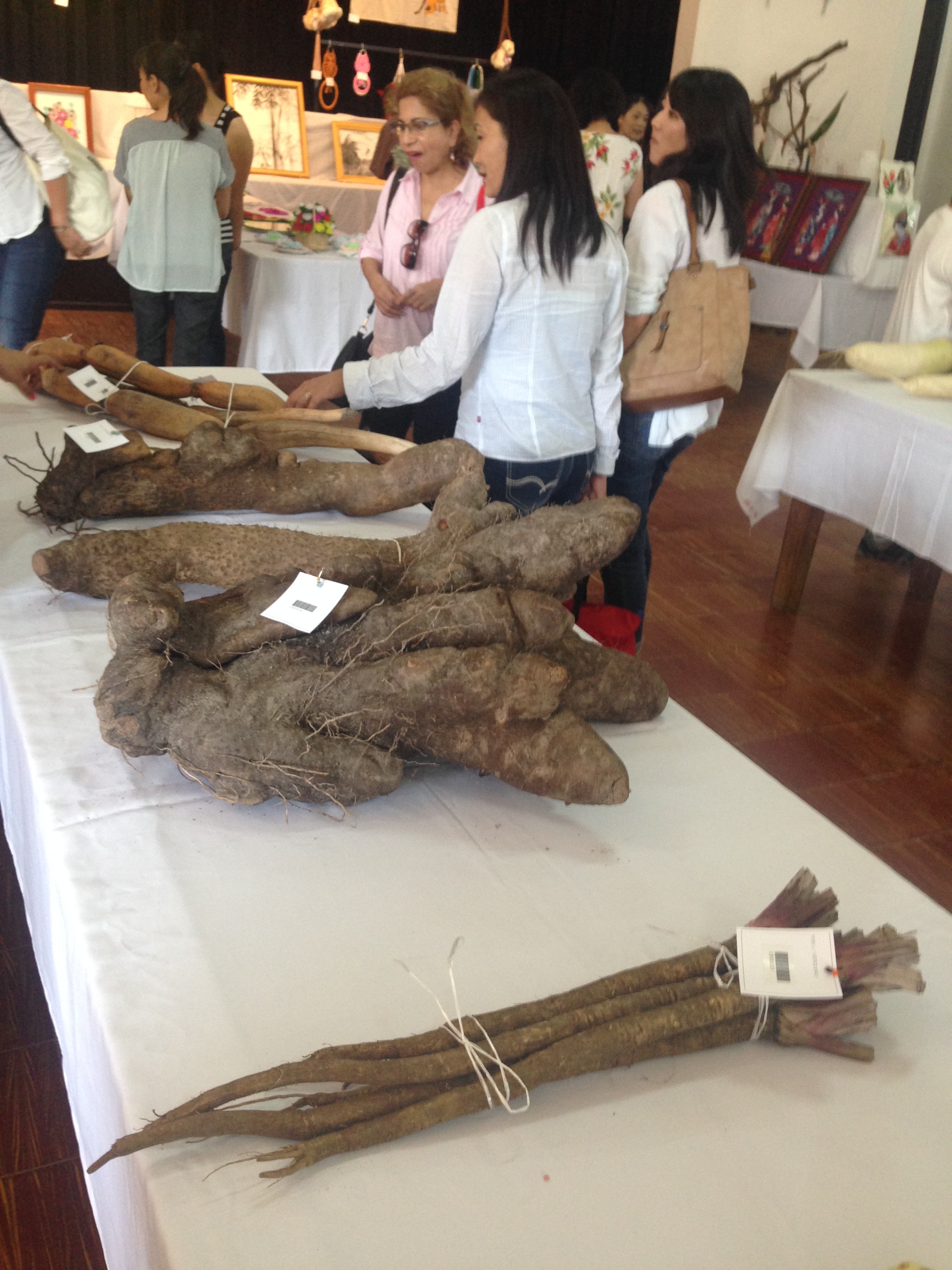 サンフアンの大きな産業といえば、養鶏です。たくさんの養鶏家がきれいな鶏卵を出展していました。また、野菜は種類が豊富です。白菜はもちろん、キュウリやナスも丸い大きな形のものだけでなく、日本で見慣れた細長い形のものもあります。生産が難しいので数は少ないですが、ごぼうや山芋もたまに八百屋さんに卸しているそうです。他にもノニやパッションフルーツなど日本にない果物がたくさん出展されていました。