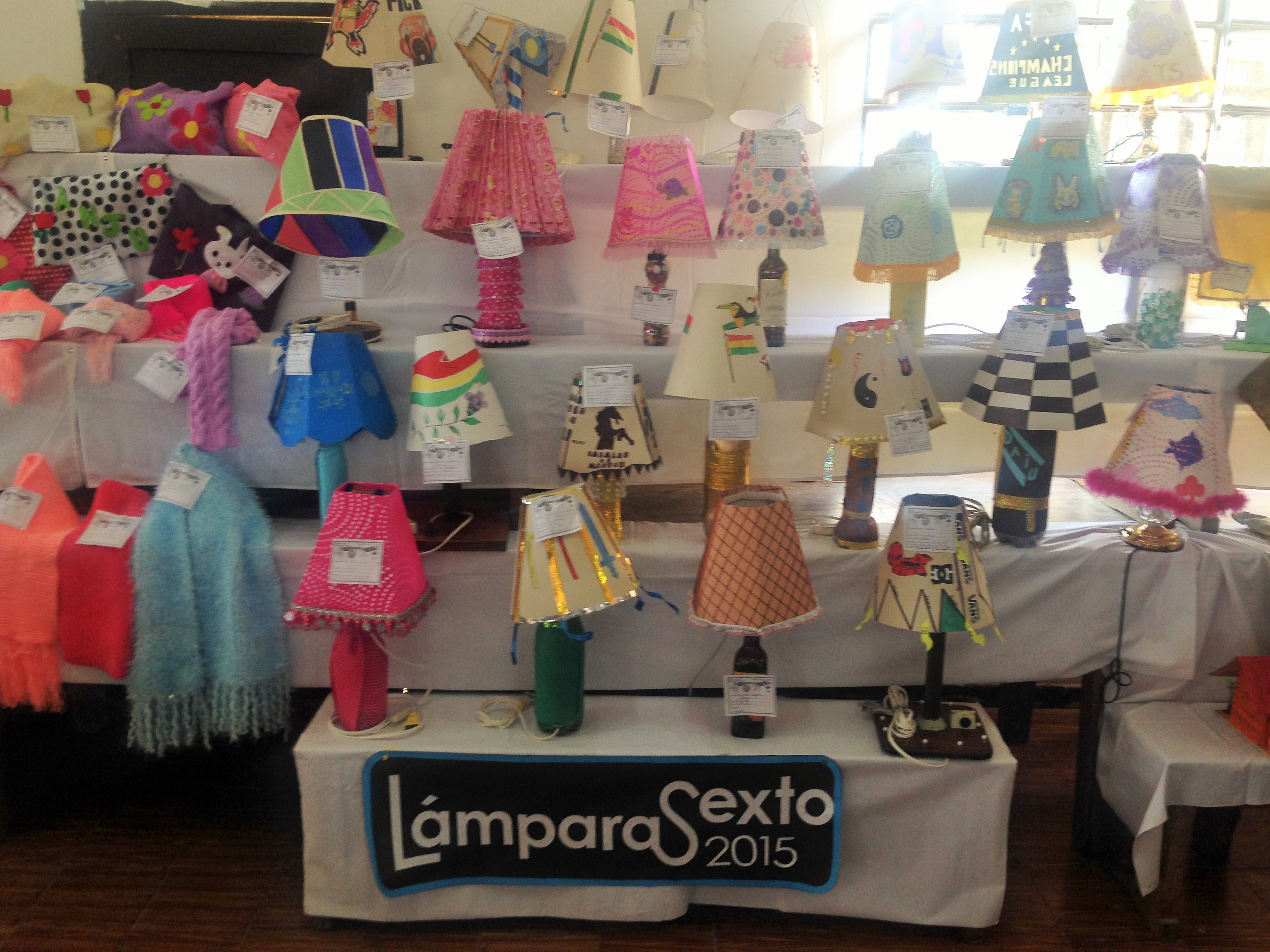 福祉施設の利用者の作品は、くるみ絵、草木染、切り絵など繊細な作品が多くならんでいました。学園の生徒は、図工の時間に作った家の模型や、リサイクルランプ(ランプ台に空き瓶やペットボトルを使用したもの)、リサイクル鉛筆立て(トイレットペーパーの芯、アイスの棒)、絵などを展示しました。